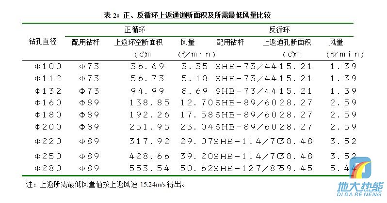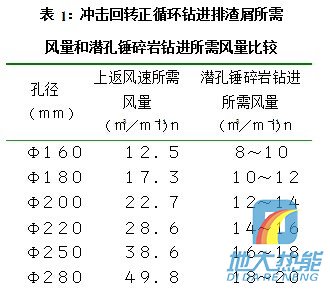 (1) 潛孔錘及雙壁鉆桿的中空斷面作為反循環(huán)通道,因斷面積小且直徑不變,在有限空 壓機(jī)供風(fēng)量條件下,可增大上返風(fēng)速,提高排渣能力,避免孔底重復(fù)破碎,從而提高鉆進(jìn)效率及增大孔深和孔徑;同時(shí)也不用經(jīng)常提拉鉆具吹孔,保持了鉆進(jìn)的連續(xù)性;