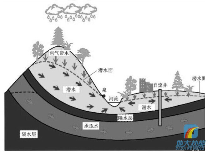 包氣帶水 是指埋藏于包氣帶中的地下水,包氣帶指巖石空隙未被地下水充滿的地帶,多為吸著水或薄膜水,而重力水較少。如果下滲水多時,可出現(xiàn)較多的重力水。 運(yùn)動:主要作垂直方向上的運(yùn)動,如重力水常由上向下運(yùn)動、毛細(xì)水由下向上運(yùn)動。 主要包括:土壤水、上層滯水、沼澤水、沙漠及濱海沙丘中的水等。一般水量不太,易受污染,故不易作為工農(nóng)業(yè)供水水源,但對于植物生長具有重要意義。 潛水 地面以下第一個穩(wěn)定隔水層以上具有自由水面的地下水 承壓水 充滿兩個隔水層之間的承受靜水壓力的地下水。